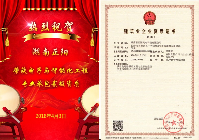 2018年4月3日,經(jīng)湖南省住房和城鄉(xiāng)建設(shè)廳批準(zhǔn),湖南正陽獲得“電子與智能化工程專業(yè)承包貳級資質(zhì)”證書。