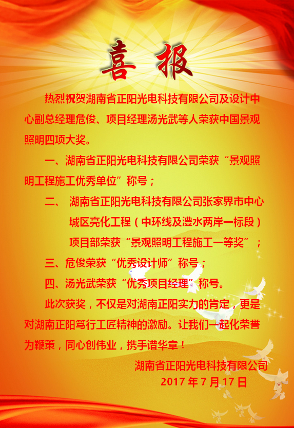 喜報-熱烈祝賀湖南省正陽光電科技有限公司及設計中心副總經理危俊、項目經理湯光武等人榮獲中國景觀照明四項大獎[2017-07-17]