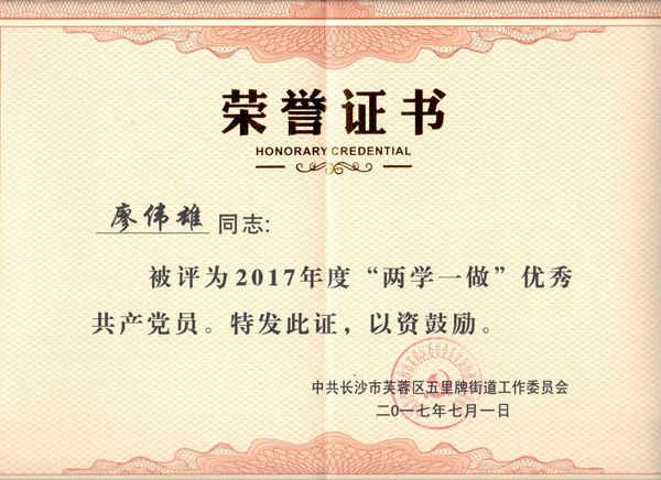 熱烈祝賀湖南正陽董事長廖偉雄先生榮獲2017年度“兩學一做”優秀共產黨員稱號[2017-07-11]