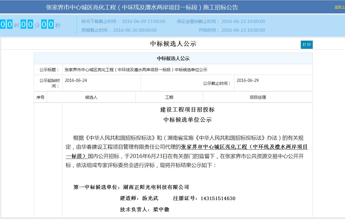 2016年6月24日,湖南省正陽光電科技有限公司成功中標張家界市中心城區亮化工程(中環線及澧水兩岸項目一標段)。